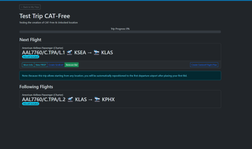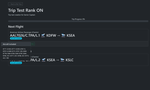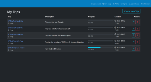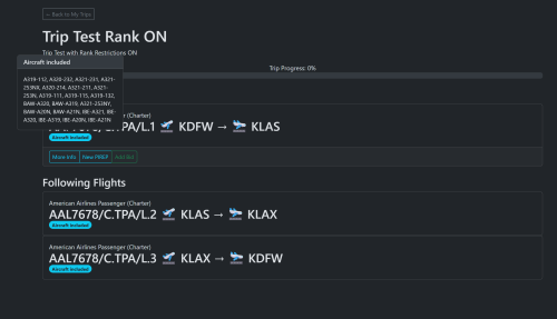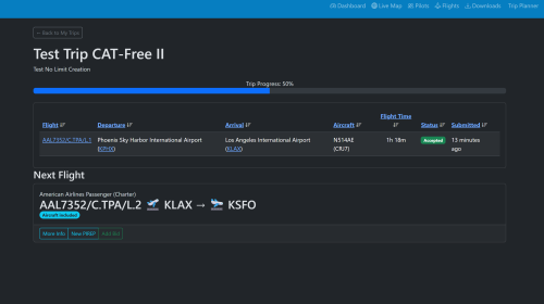 - Trip Detail page: “Next Flight” card with quick actions (Info, New PIREP, SimBrief)