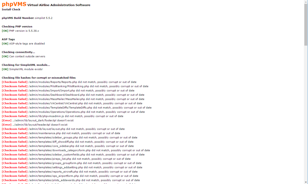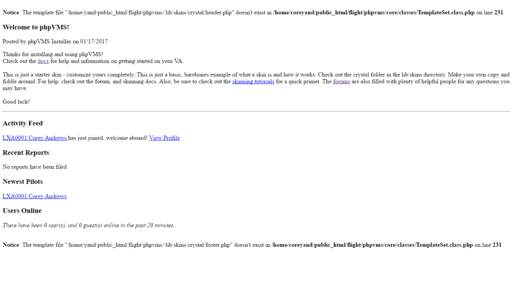 Good Afternoon Everyone, I'm trying to install phpVMS 5.5.2 on my website, which is currently running PHP version 5.6. I have run the PHP Checker: Install Check phpVMS Build Number: simpilot 5.5.2 Checking PHP version[OK] PHP version is 5.6.29.xASP Tags[OK] ASP-style tags are disabledChecking connectivity...[OK] Can contact outside serversChecking for SimpleXML module...[OK] SimpleXML module exists! When I go to the default directory, it returns this: Notice: The template file "/home/yand/public_html/flight//lib/skins/crystal/header.php" doesn't exist in /home/coreyand/public_html/flight/core/classes/TemplateSet.class.php on line 231 Welcome to phpVMS! Posted by phpVMS Installer on 01/14/2017 Thanks for installing and using phpVMS! Check out the docs for help and information on getting started on your VA. This is just a starter skin - customize yours completely. This is just a basic, barebones example of what a skin is and how it works. Check out the crystal folder in the lib/skins directory. Make your own copy and fiddle around. For help, check out the forum, and skinning docs. Also, be sure to check out the skinning tutorials for a quick primer. The forums are also filled with plenty of helpful people for any questions you may have. Good luck! Activity Feed LXA0001 has just joined, welcome aboard! View Profile Recent Reports No reports have been filed Newest Pilots LXA0001 Users Online There have been 0 user(s), and 0 guest(s) online in the past 20 minutes. Notice: The template file "/home/yand/public_html/flight//lib/skins/crystal/footer.php" doesn't exist in /home/coreyand/public_html/flight/core/classes/TemplateSet.class.php on line 231 Going to /admin returns this: Warning: opendir(/home/yand/public_htl/flight//admin/modules): failed to open dir: No such file or directory in /home/coreyand/public_html/flight/core/classes/MainController.class.php on line 68Warning: readdir() expects parameter 1 to be resource, boolean given in /home/coreyand/public_html/flight/core/classes/MainController.class.php on line 70Warning: readdir() expects parameter 1 to be resource, boolean given in /home/coreyand/public_html/flight/core/classes/MainController.class.php on line 70Warning: readdir() expects parameter 1 to be resource, boolean given in /home/coreyand/public_html/flight/core/classes/MainController.class.php on line 70 I have tried googling at least 10 other support threads or websites, with no results in solving to fix this. Does anyone here have any suggestions? I have attempted reinstalling this 5-6 times now.