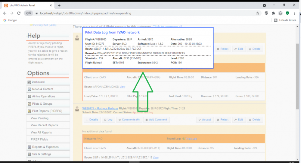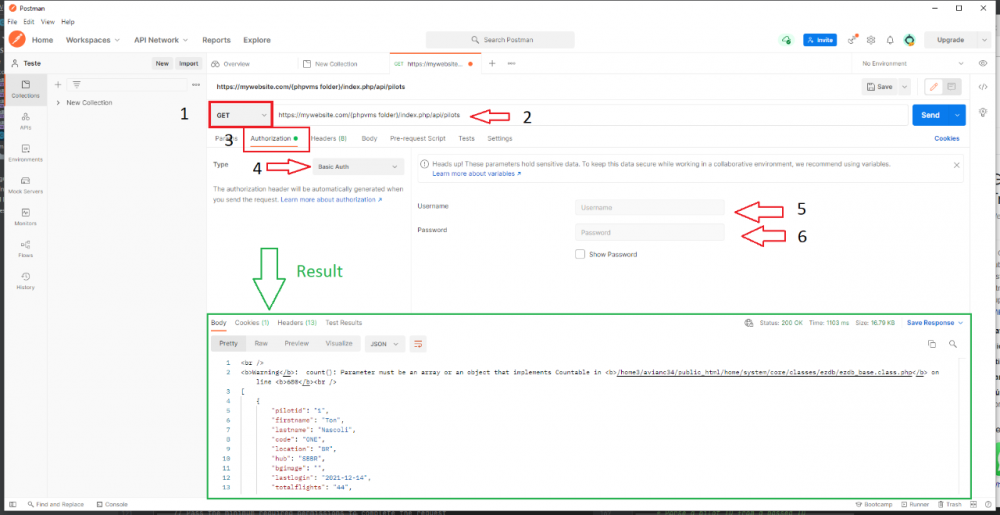 Enter your username. This is where I was wrong and it's not clear from the API documentation. Your username is your ID and not your callsign used when you log into phpVMS. So, ID is the number (unless zeros) that after airline code. Example: My login callsign is XYZ0001, so my username is 1.