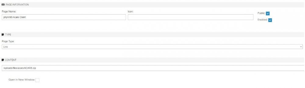 So I got it working but not in the way you described. First, for house cleaning I delete the public folder in phpvms since during the intial install of phpvms I placed the contents on the public folder into /public_html When I dleted the public folde, the site still ran. Still getting a 403 error when I click on downloads from the menu bar Then I added a link to /uploads/files/acars/ACARS.zip in the "pages/links" section of config (see snip) Now in my menu I have Downloads, still gives me a 403 error, but I also have phpVMS Acars client show up. If I click that link, it downloads the ACARS.zip file. How do I fix the Download menu item giving me a 403 Error. There is no link in the VMSAcars section any longer either. I would prefer to get the Downloads link working again and have it show up there. Ideas?