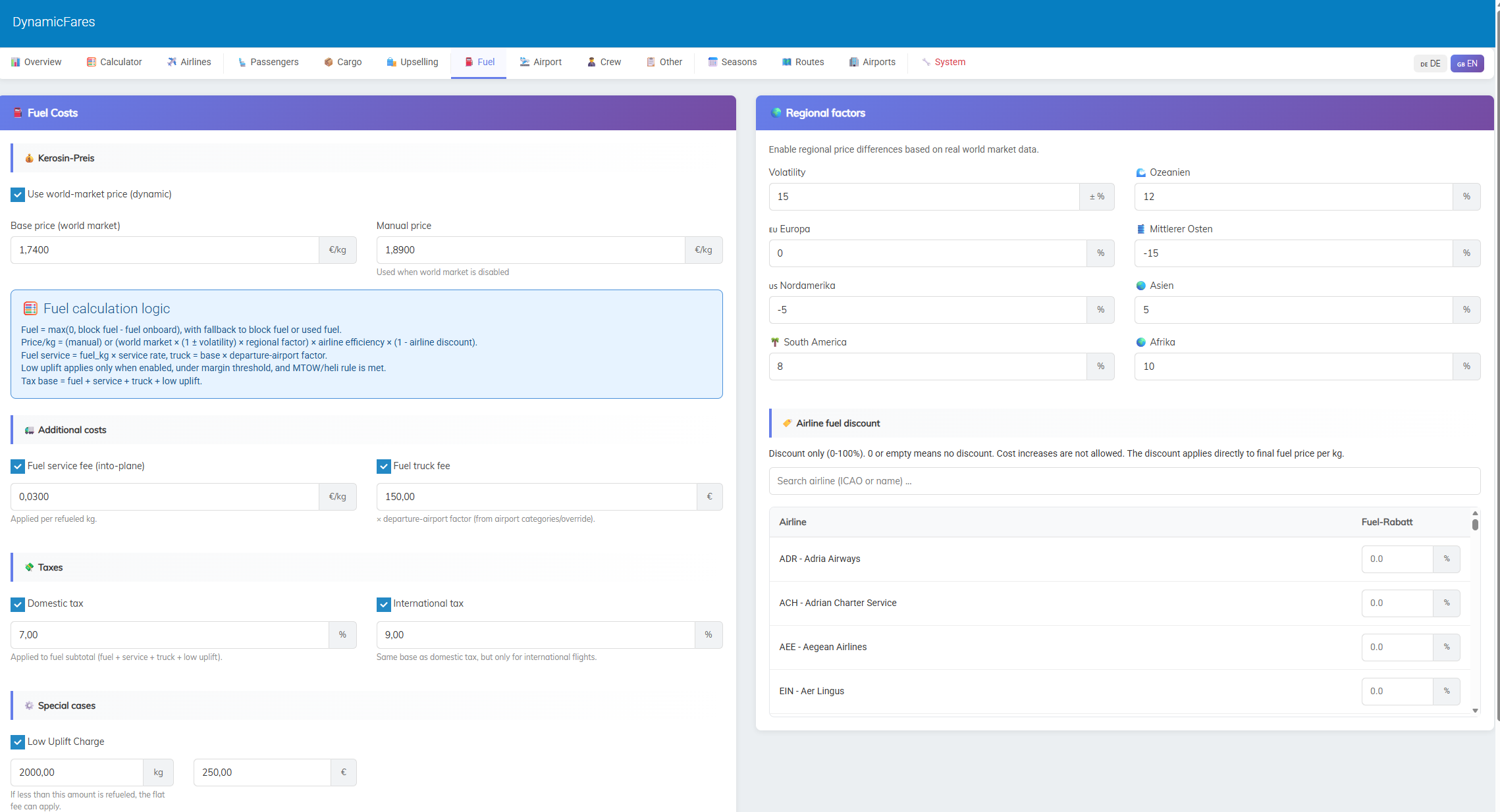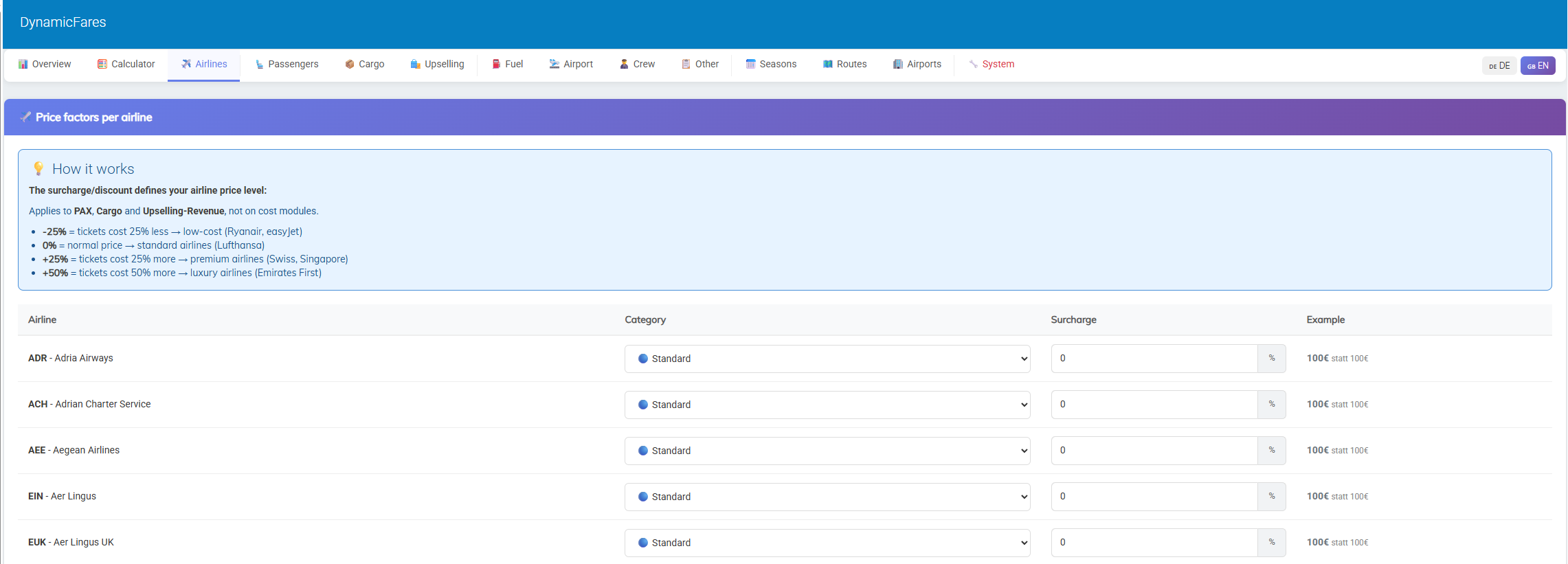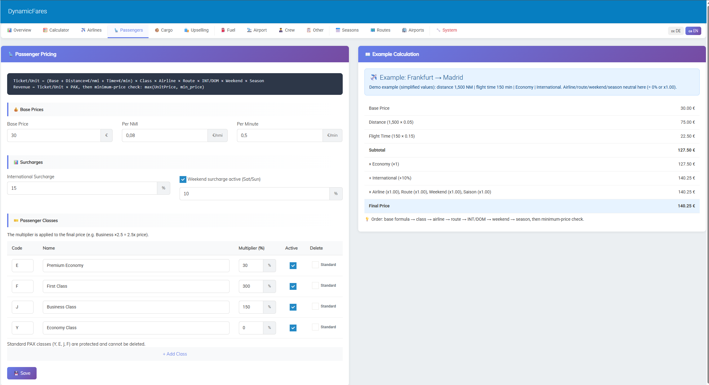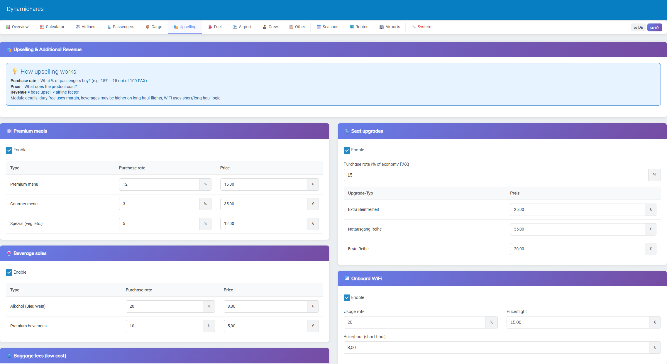 This allows you to build very different pricing models depending on whether you want a low-cost, standard, premium, or more advanced airline setup.