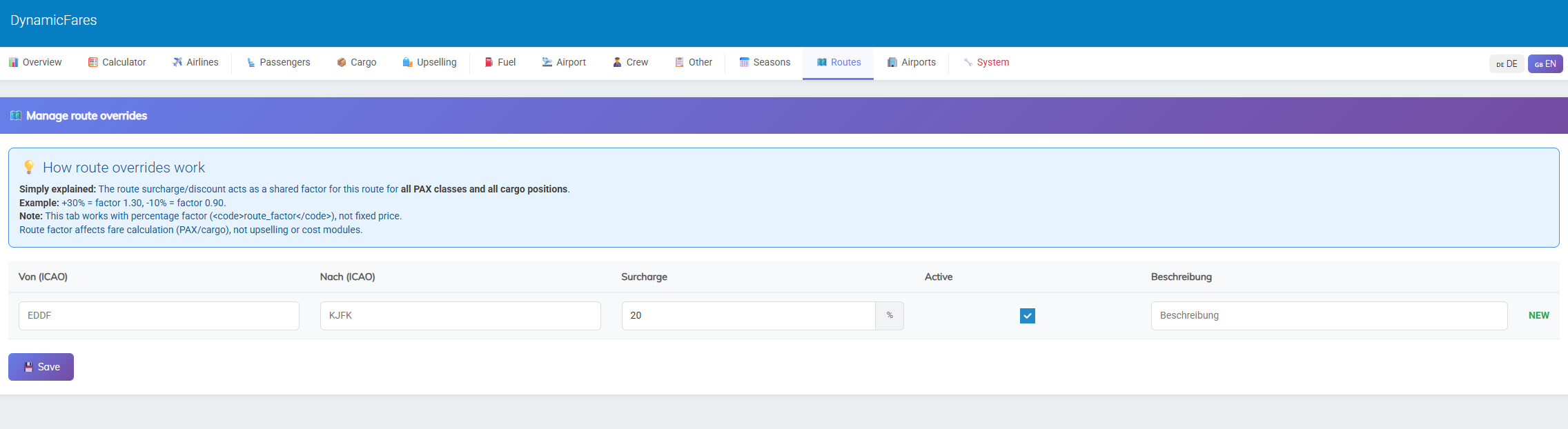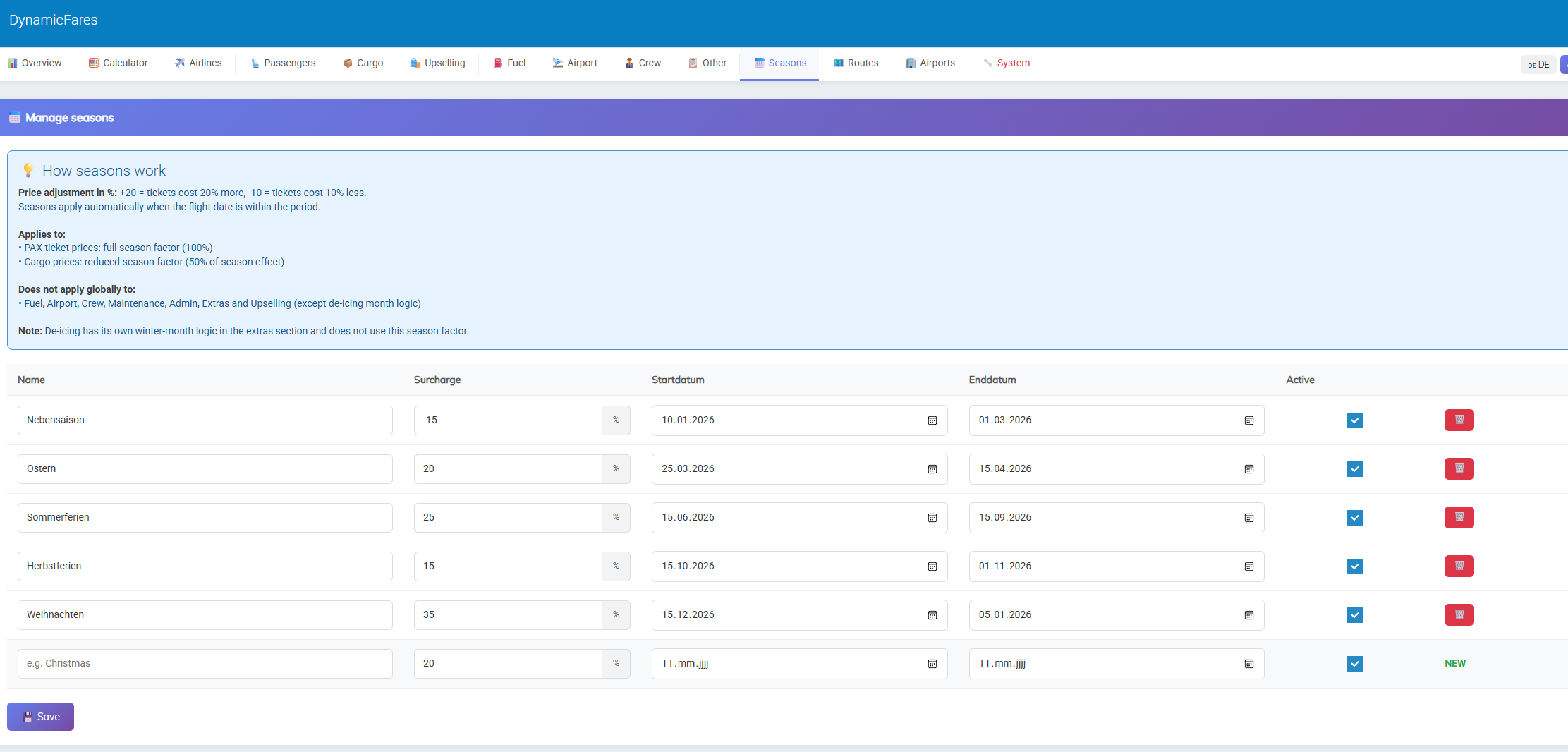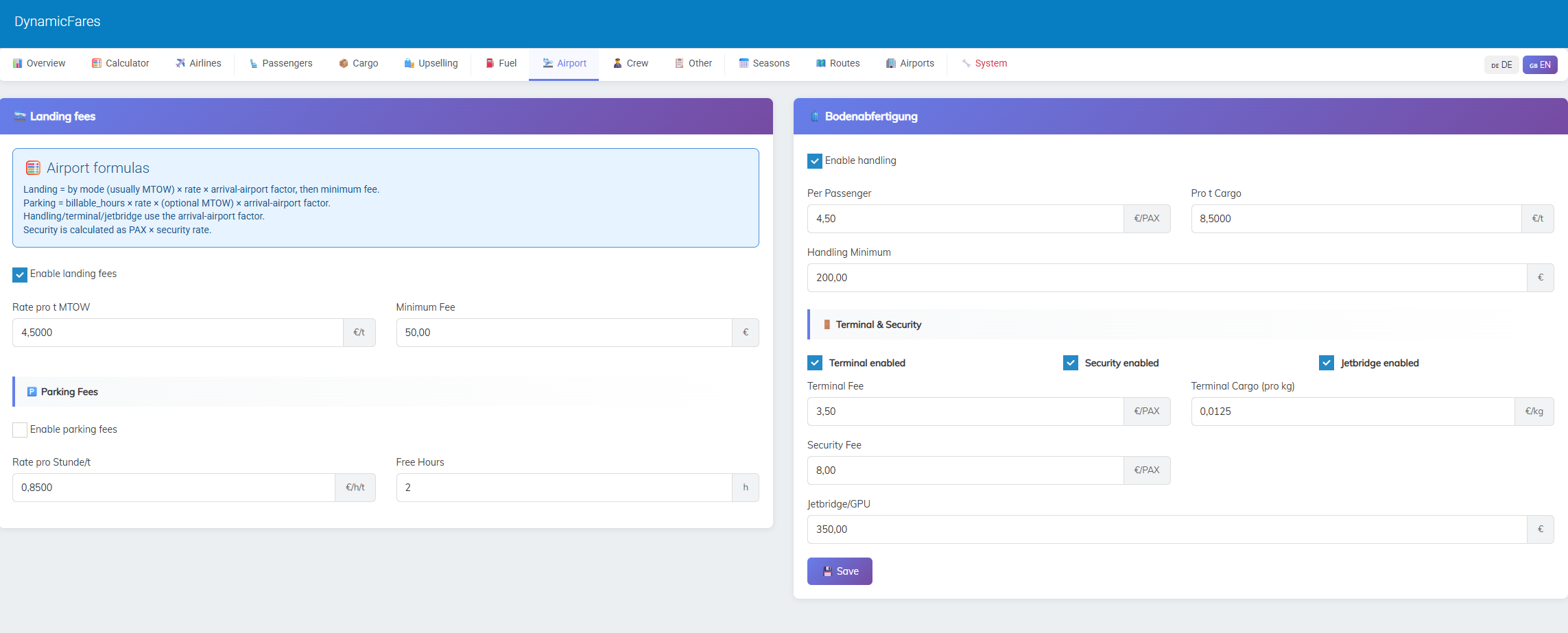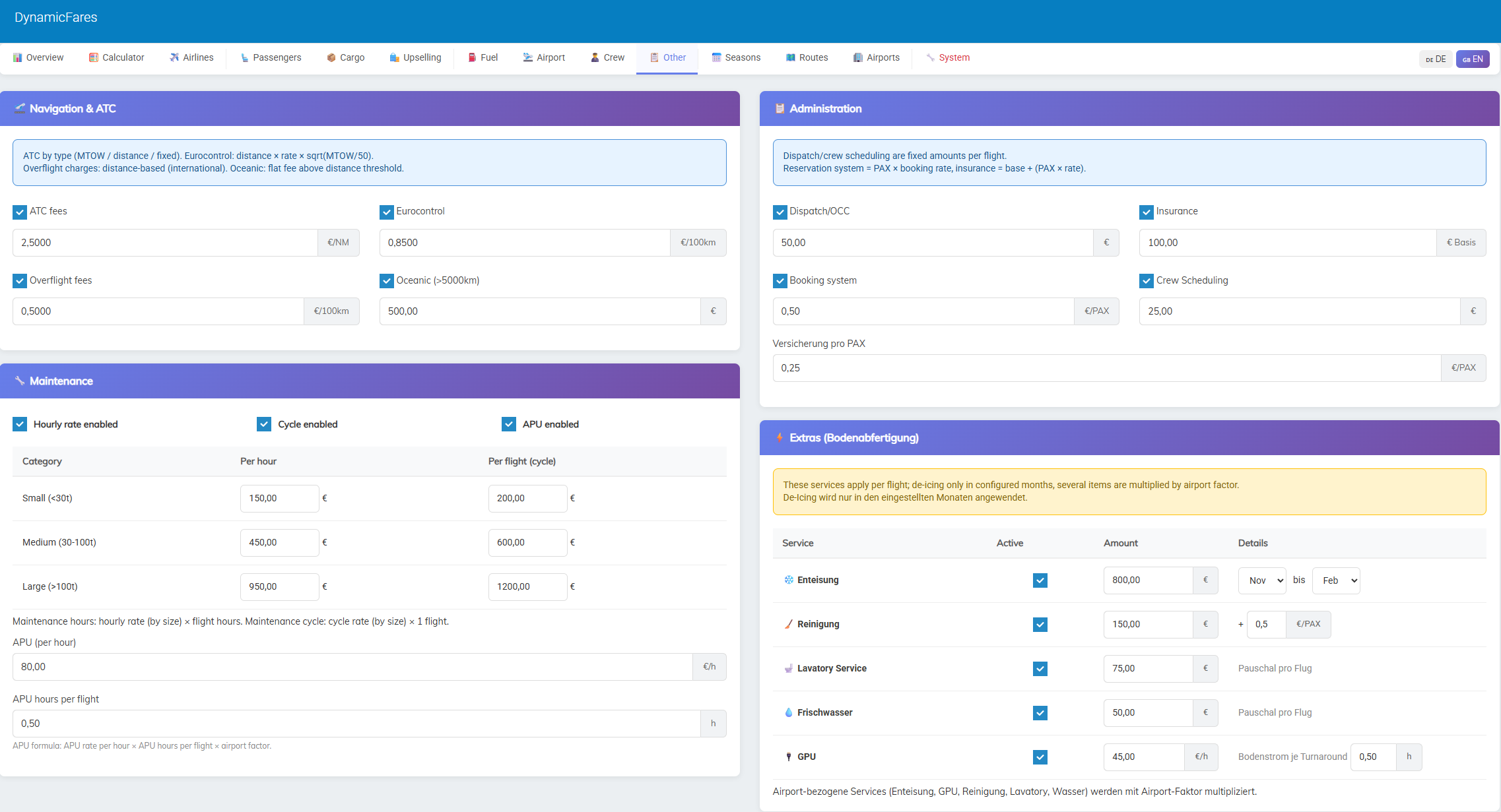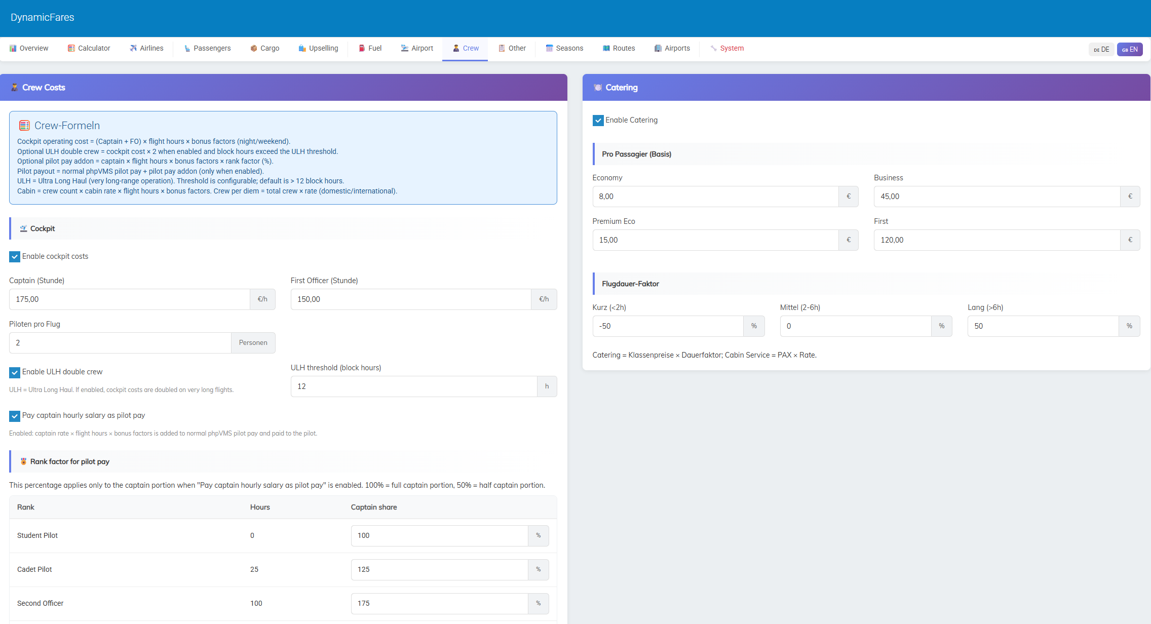 This allows you to build very different pricing models depending on whether you want a low-cost, standard, premium, or more advanced airline setup.