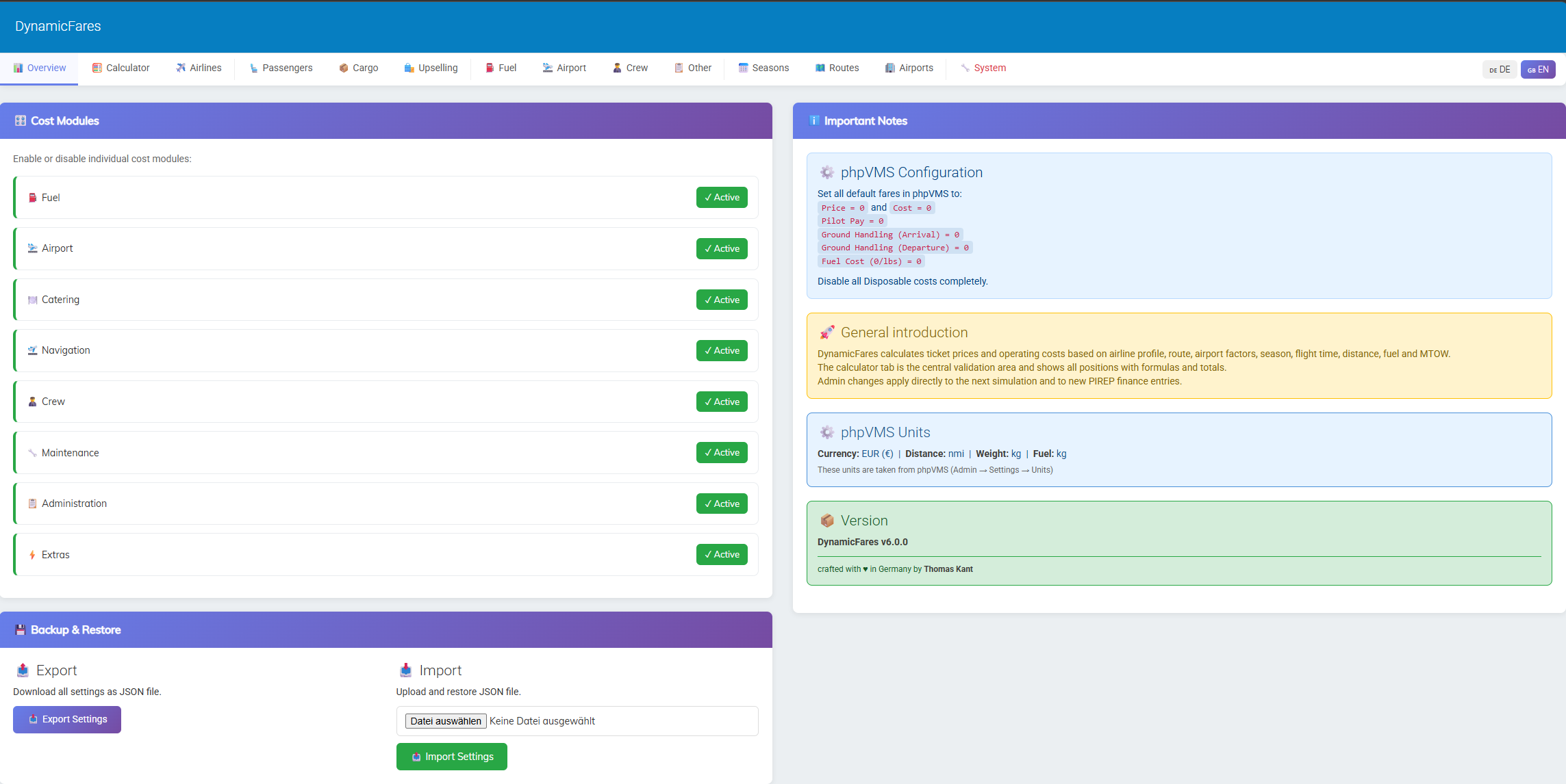 The module is intended for phpVMS 7 and was built for people who want more advanced fare and operating cost logic than the default system provides.